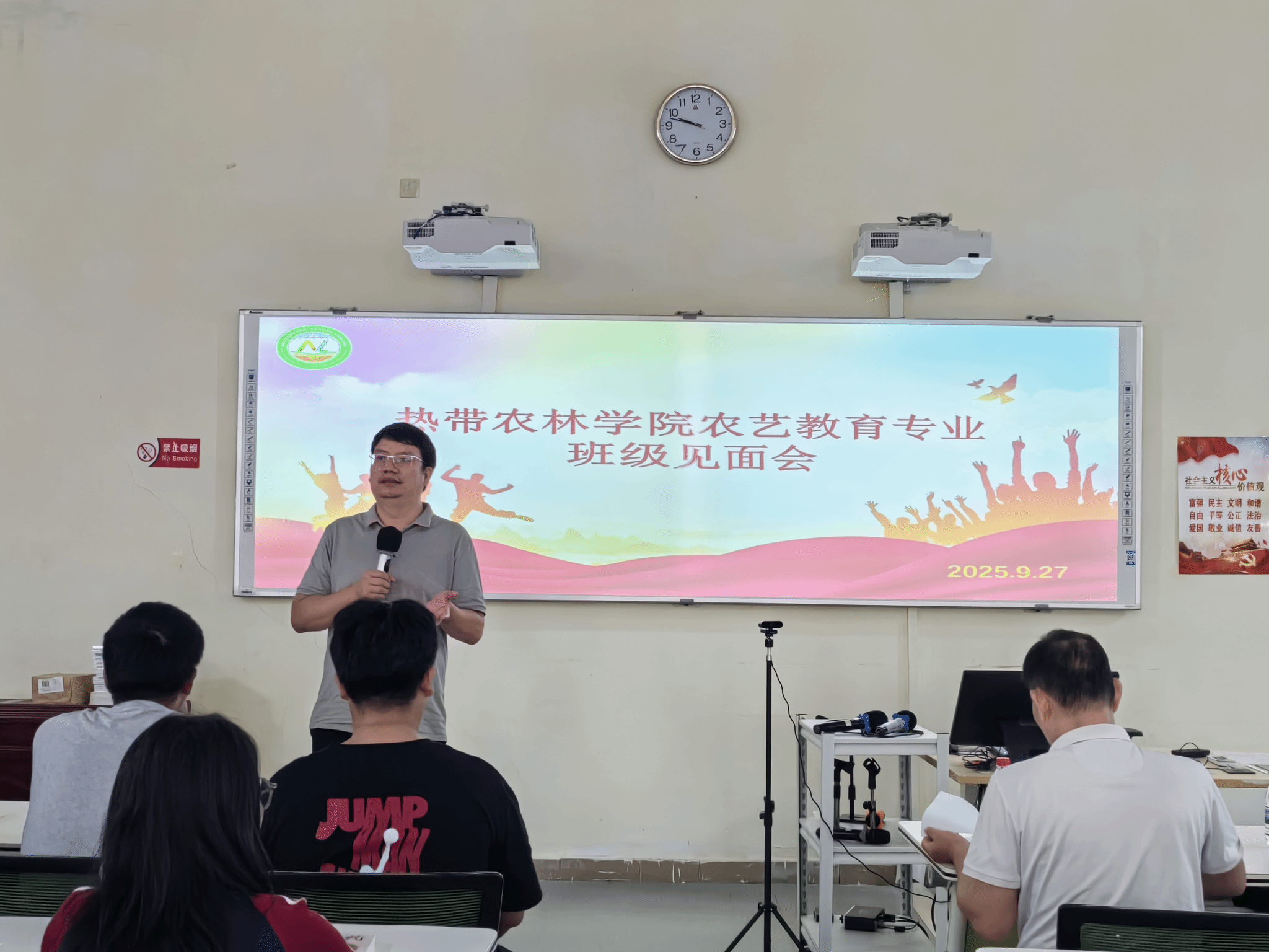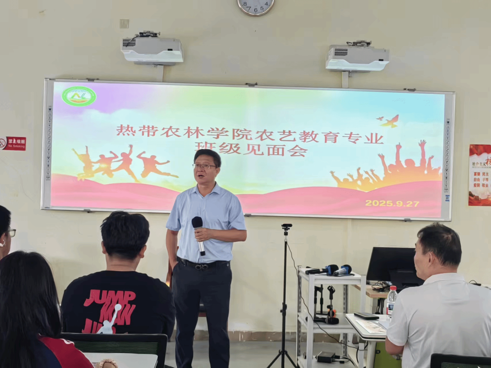 9月27日上午,农艺教育系2025级本科生新生见面会在儋州校区7101教室隆重举行。公司党委书记于旭东、党委副书记盘毅、系主任骆焱平、副主任王兰英和陈娜及各班级学业顾问出席本次活动,会议由骆焱平教授主持。