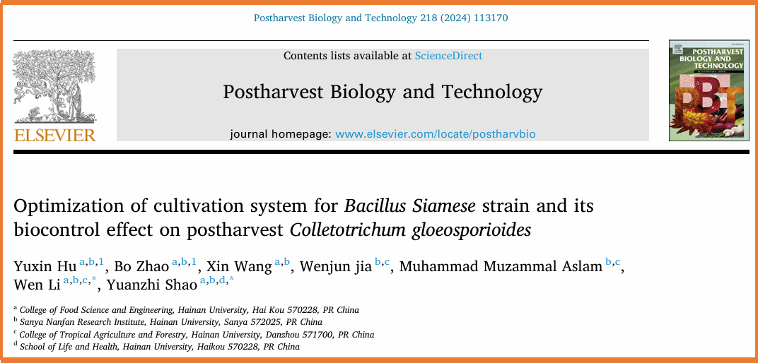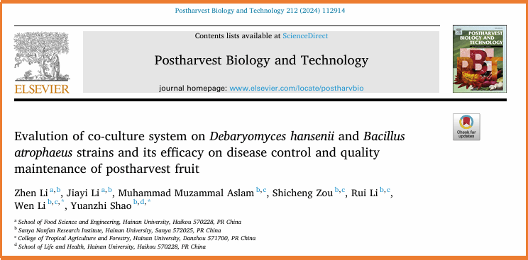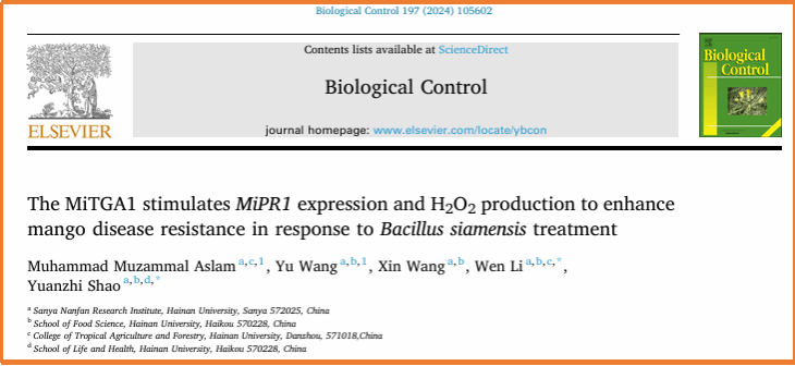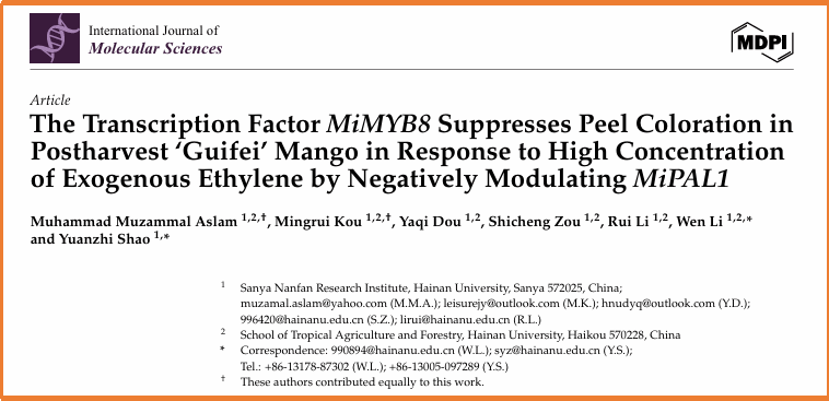 二、围绕芒果采后病害的绿色防控开展了深入研究,探讨了拮抗菌高效培养的条件和体系,研究了拮抗菌提高芒果抗病性和改善贮藏品质的生理与分子调控机制;研究了芒果色泽品质形成的机理及其调控网络,相关结果发表在《Postharvest Biology and Technology》(IF2024=6.590,中科院1区,TOP期刊),《Biological Control》(IF2024= 3.7,中科院1区,TOP期刊)和《International journal of Molecular Science》(IF2024= 5.6,中科院2区)上。该研究得到了国家自然科学基金面上项目(32072275)、国家自然科学基金地区项目(32060564),国家重点研发计划项目(2023YFD2300803-7)和海南省院士团队科研项目(YSPTZX202213)的支持。