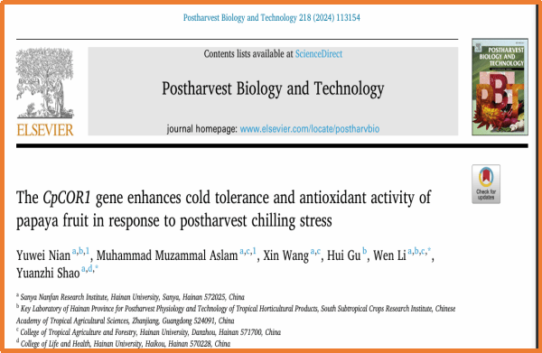 四、针对番木瓜果实冷害发生引起的品质下降问题,研究了CpCOR1在冷激处理提高番木瓜果实抗冷性的作用机制,相关结果发表在《Postharvest Biology and Technology》(IF2024= 6.590,中科院1区,TOP期刊)上。该研究得到了海南省院士团队创新中心建设经费的支持(SQ2021YSPTJXRWS0074)。