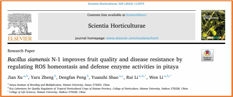 五、围绕火龙果采后腐烂和品质下降关键问题,研究了拮抗菌N-1通过调节果实活性氧代谢来控制火龙果病害、提高果实品质的内在机制,相关结果发表在《Scientia Horticulturae》(IF2024= 3.9,中科院2区,TOP期刊)上。该研究得到了海南省自然科学基金项目(321QN186)和海南省院士团队创新中心建设经费的支持(SQ2021YSPTJXRWS0074)。