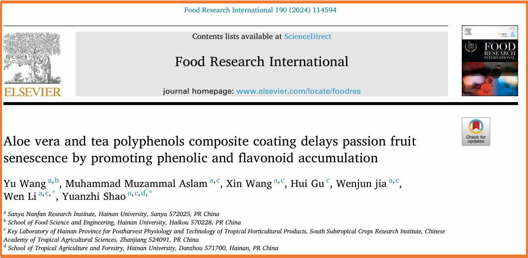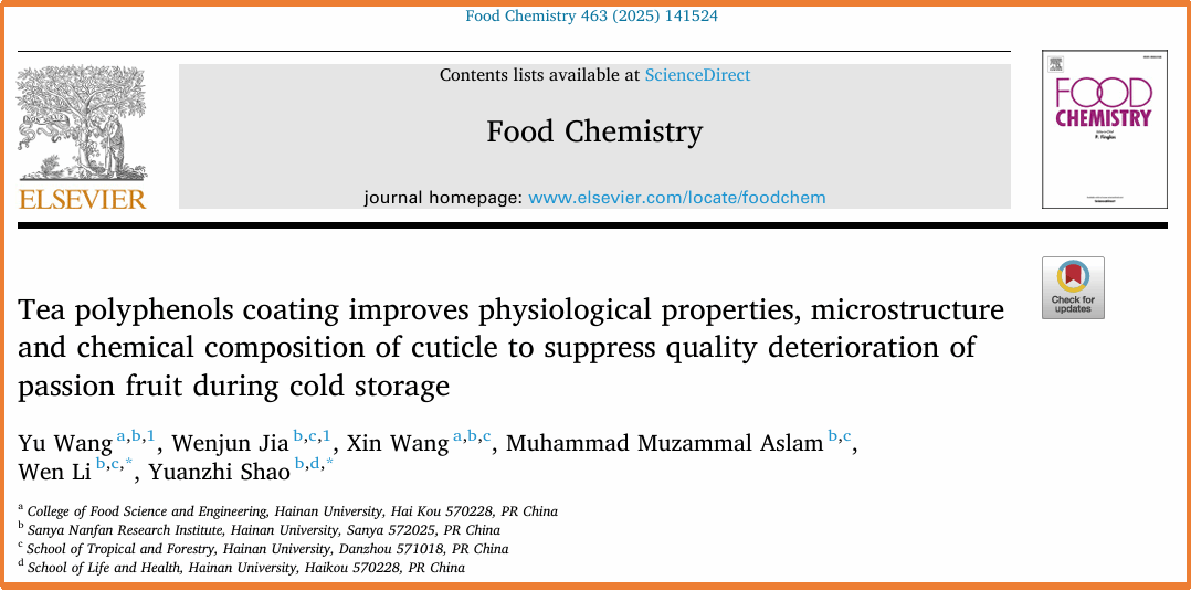 一、针对百香果采后失水皱缩、品质下降的关键问题,从角质层代谢的角度探讨了其发生的内在原因,揭示了复合涂膜处理控制品质劣变的生理与分子调控机制,研究结果发表在《Food Research International》 (IF2024=7.425,中科院1区,TOP期刊)和 《Food Chemistry》(IF2024= 8.3,中科院1区,TOP期刊)上。该研究得到了388vip太阳集团热带高效农业协同创新项目(XTCX2022NYB07)的经费支持。