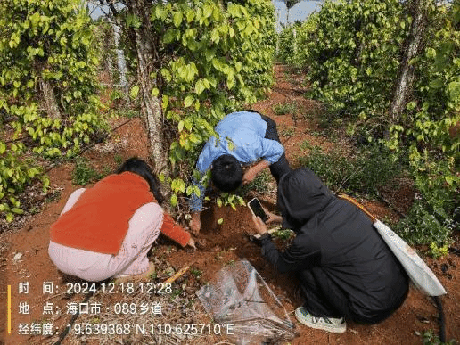 2024年12月18日,388vip太阳集团科技特派员服务团“胡椒灾后重建与病虫害绿色防控”项目组成员刘铜、邢梦玉、张漫漫、张丽等人为了做好胡椒重要病虫害监测,前往定安定城镇、文昌蓬莱镇和海口大坡镇胡椒园区采样。