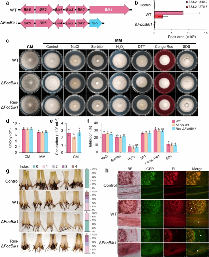 香蕉是全球产量、贸易量和消费量最大的水果之一,是众多发展中国家重要的经济作物。然而,由尖孢镰刀菌古巴专化型(Foc TR4)引发的香蕉枯萎病,已成为全球香蕉产业面临的最严重威胁。尖孢镰刀菌属为土传病原真菌,具有广泛的寄主范围,可导致多种作物发生致死性的枯萎病。在其生长过程中,Foc TR4及其他多种镰刀菌均可合成一种粉红色的次生代谢产物——比卡菌素(bikaverin),但其在病原菌生物学中的功能长期以来尚不明确。