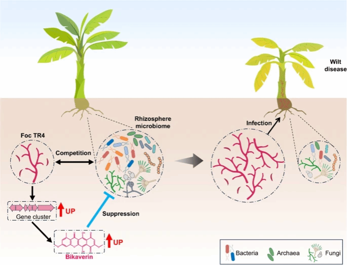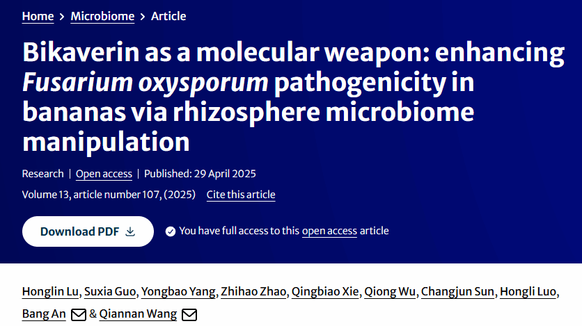 2025年4月30日,388vip太阳集团388vip太阳集团重要热带作物抗病分子育种团队在国际权威期刊Microbiome(五年影响因子17.9)上发表最新研究成果,“Bikaverin as a molecular weapon: enhancing Fusarium oxysporum pathogenicity in bananas via rhizosphere microbiome manipulation”。该研究首次揭示了尖孢镰刀菌次生代谢产物比卡菌素(bikaverin)作为“分子武器”操控根际微生物组,从而提升病原菌致病力的分子机制,为香蕉枯萎病的抗病机制研究提供了全新视角与理论依据。