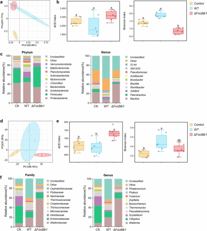 与此同时,已有研究表明,植物根际微生物群在调节植物生长发育、营养获取以及抗病性等方面发挥着关键作用。并且在离体条件下,比卡菌素能够抑制多种微生物的生长。由此,研究团队提出一个新假设:比卡菌素可能具备类抗生素功能,通过抑制根际微生物,增强Foc TR4在土壤环境中的竞争优势,进而提升其致病力。为了验证这一假设,研究人员进一步比较了野生型菌株与比卡菌素合成缺陷菌株对香蕉根际微生物群的影响,以及两者在土壤中的丰度变化。结果显示,比卡菌素能够显著抑制根际微生物群中细菌的整体丰度,特别是对芽孢杆菌等益生菌具有明显抑制作用,同时促进镰刀菌自身的富集。