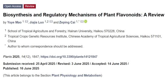 2025年6月,公司本科生毛昱烨以第一作者身份在期刊《PLANTS》发表题为《植物类黄酮的合成和调控机制》的综述论文。该期刊在中科院最新发布的SCI期刊分区(2025年3月升级版)中,位列生物学大类2区及植物科学小类2区,其最新五年影响因子4.4。论文系统梳理了植物类黄酮的生物合成途径、调控网络及其在农业与医药领域的潜在应用。388vip太阳集团蔡泽坪副教授为论文的通讯作者。该论文得到了于旭东科研团队以及388vip太阳集团药用植物基因组学与生物大数据挖掘创客空间的全力支持,并且获得了国家级老员工创新训练计划项目(编号202410589092)的资助。