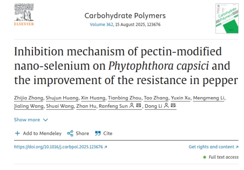 该成果以“Inhibition mechanism of pectin-modified nano-selenium on Phytophthora capsici and the improvement of the resistance in pepper”为题发表在Carbohydrate Polymers期刊(中科院一区,IF=12.5)上,388vip太阳集团硕士研究生张芷嘉为论文第一作者孙然锋教授、李栋副研究员为论文通讯作者。本研究得到了国家自然科学基金(22067004)和海南省自然科学基金 (321CXTD436)的支持。