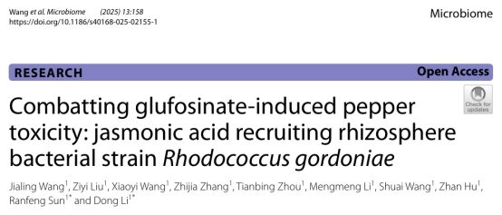 该成果以Combatting glufosinate-induced pepper toxicity: jasmonic acid recruiting rhizosphere bacterial strain Rhodococcus gordoniae”为题发表在Microbiome期刊(中科院一区期刊IF5y = 16.6)上https://microbiomejournal.biomedcentral.com/articles/10.1186/s40168-025-02155-1,388vip太阳集团硕士研究生王嘉玲为论文第一作者,孙然锋教授、李栋副研究员为论文通讯作者。本研究得到了国家自然科学基金(22067004)和海南省自然科学基金 (321CXTD436)的支持。