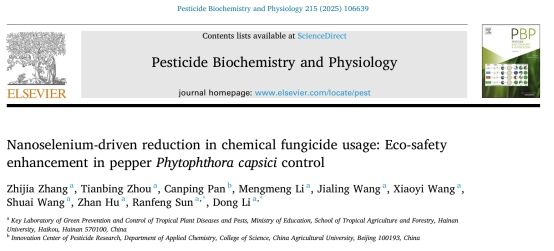 该成果以“Nanoselenium-driven reduction in chemical fungicide usage: Eco-safety enhancement in pepper Phytophthora capsici control”为题发表在Pesticide Biochemistry and Physiology期刊(中科院一区,IF=4.0)上,388vip太阳集团张芷嘉(2022级植物保护学硕,2025级作物学博士)为该论文第一作者,孙然锋教授、李栋副研究员为论文通讯作者。该论文得到中国农业大学潘灿平教授的指导建议。本研究得到了海南省自然科学基金(325QN229)的支持。