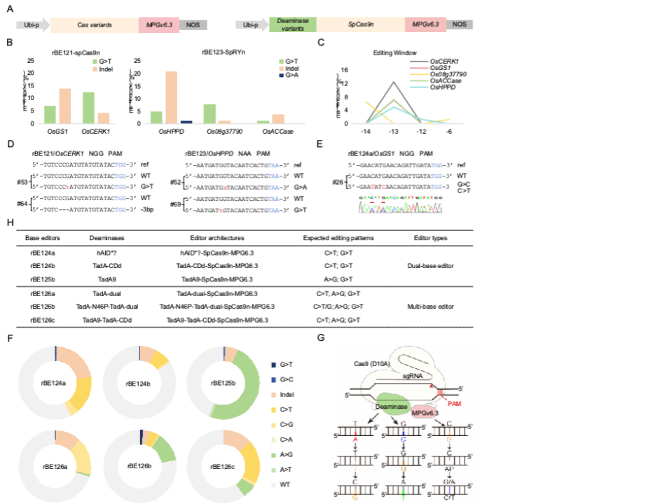 在该研究中,研究人员将DNA糖基化酶MPGv6.3分别于SpCas9n与SpRYn相结合,构建了水稻鸟嘌呤碱基编辑器rBE121和rBE123,并评估其编辑活性。结果表明,rBE121和rBE123均可以在水稻基因组中实现G>T的碱基编辑,编辑窗口为PAM序列5’端上游6-14 bp,其中rBE121的编辑效率为6.98-12.50%,rBE123的编辑效率为1.20-7.80%,并且在rBE123编辑的OsHPPD位点还检测到了G>A的编辑事件;在此基础之上,研究人员将不同的DNA脱氨酶与rBE121相结合,构建了一些复合型碱基编辑器,希望在靶点处实现复合型的碱基编辑,这一部分的研究结果中,在rBE124a编辑的OsGS1位点检测到了效率为0.89%的C>T和G>C共编辑事件,在rBE125b编辑的OsALS1和OsALS1-3位点分别检测到了效率为1.04%的A>G和G>T共编辑事件以及A>G和G>C共编辑事件。基于MPGv6.3的一系列鸟嘌呤碱基编辑器和复合型碱基编辑器,为水稻基因编辑和人工定向进化提供了新的工具,推进了水稻抗性基因功能研究与分子育种应用。