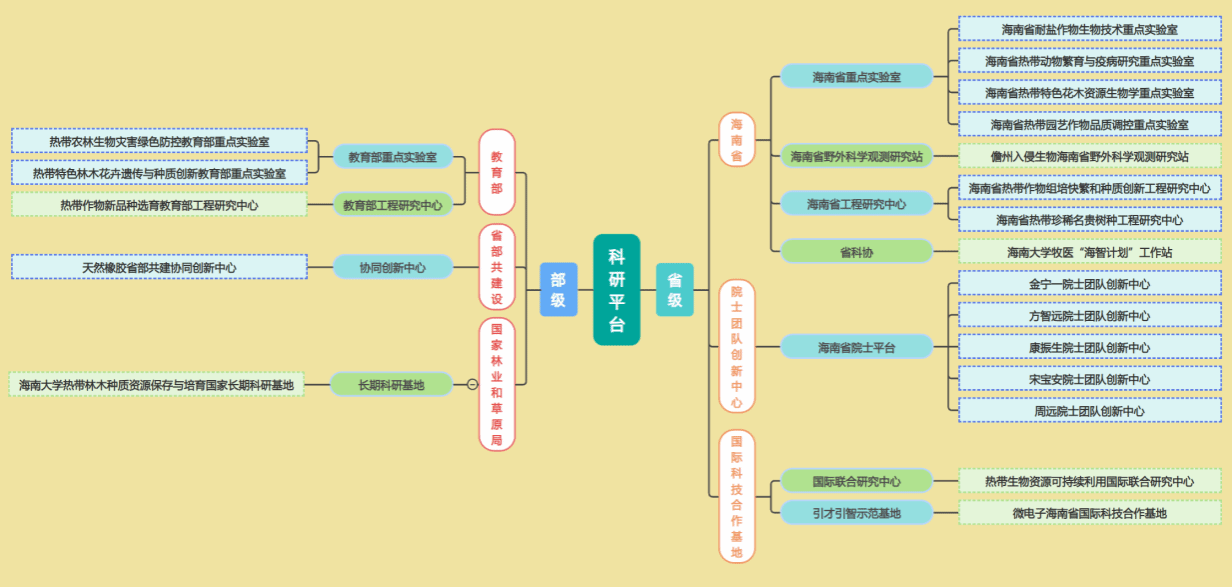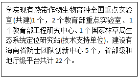 公司高度重视科学研究与成果应用,拥有1个热带作物生物育种全国重点实验室(共建),2个教育部重点实验室,1个教育部工程研究中心,1个国家林草局生态系统定位研究站(技术支持单位),建设有海南省院士团队创新中心5个,省部级和地厅级平台共计22个。