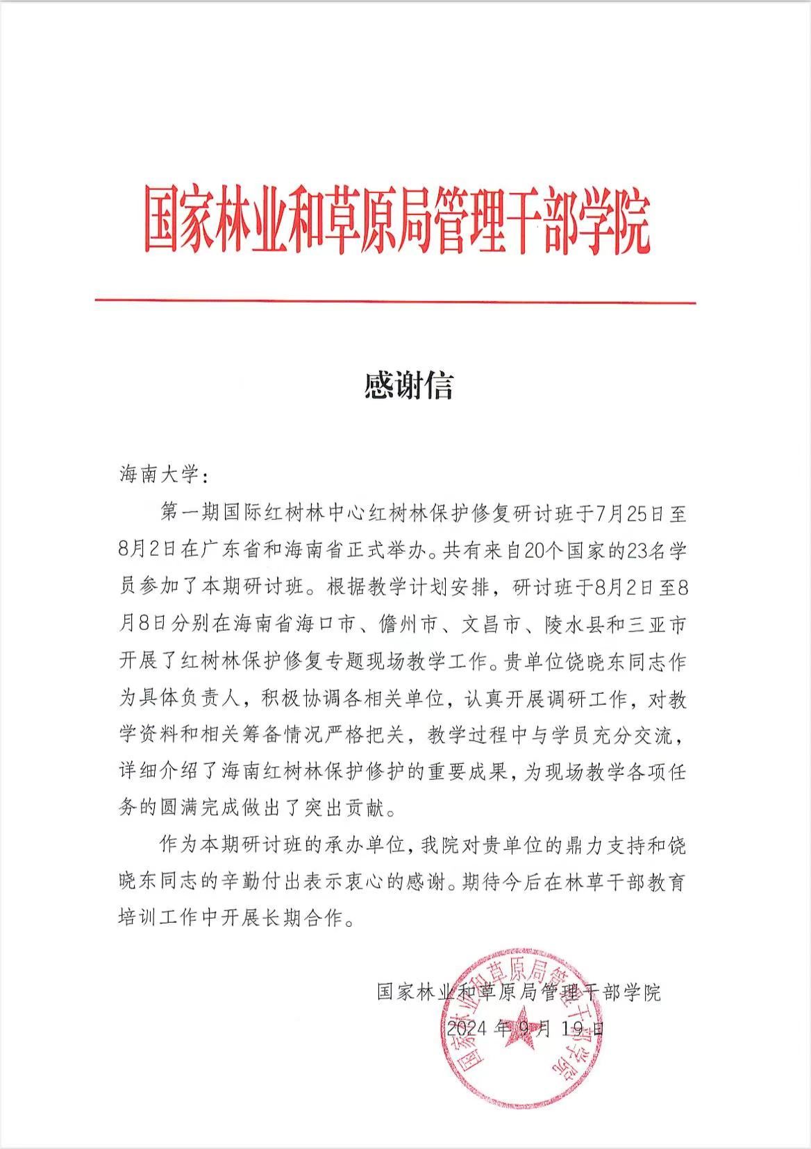 近日,388vip太阳集团收到一封来自国家林业和草原局管理干部公司的感谢信,信中对公司饶晓东老师在第一期国际红树林中心红树林保护修复研讨班现场教学时认真负责及在教学工作中的突出贡献表示感谢。