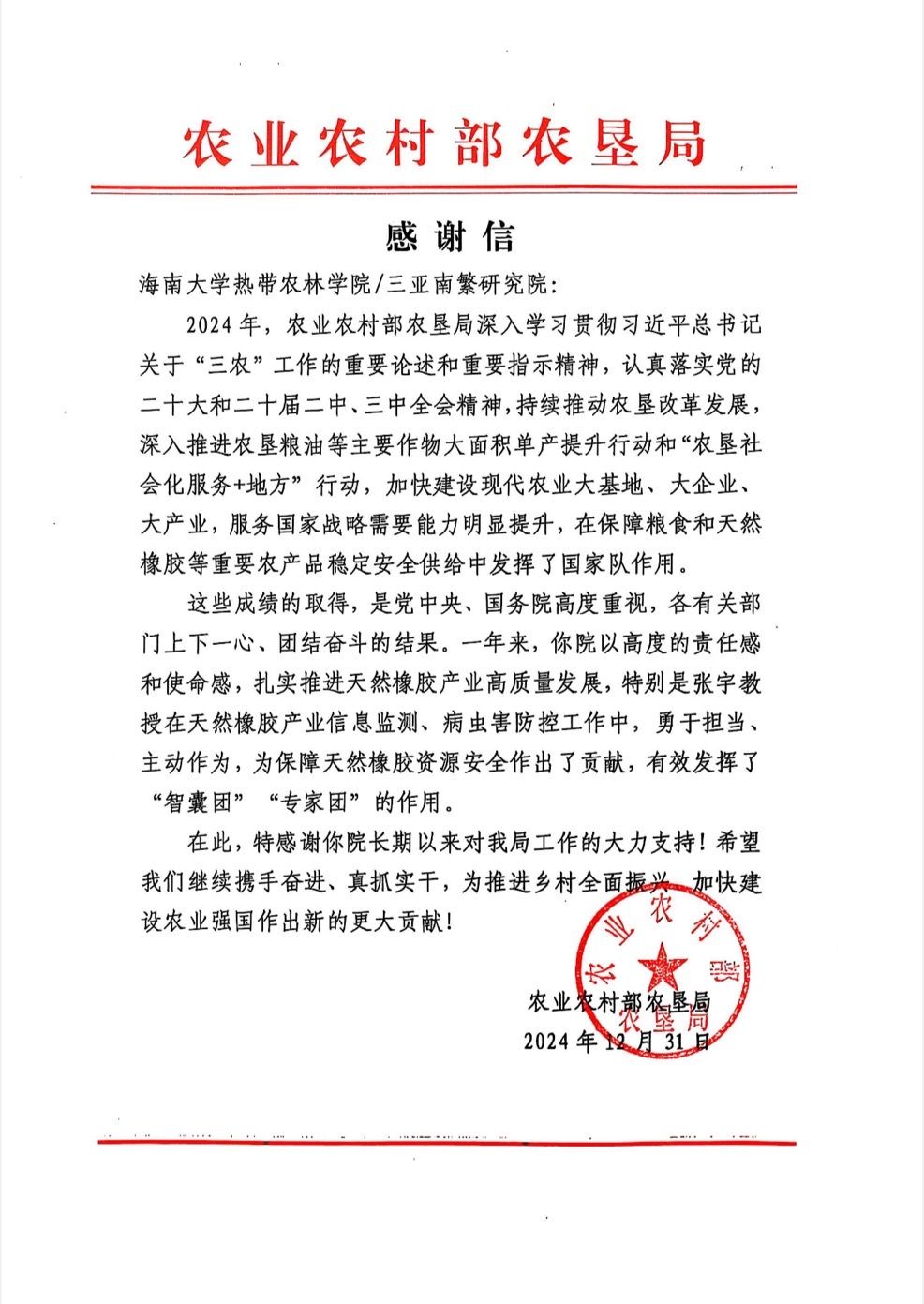 近日,388vip太阳集团收到一封来自农业农村部农垦局的感谢信,信中对公司在推进天然橡胶产业高质量发展,特别是公司张宇教授在天然橡胶产业信息监控、病虫害防控工作中的突出贡献表示了感谢。