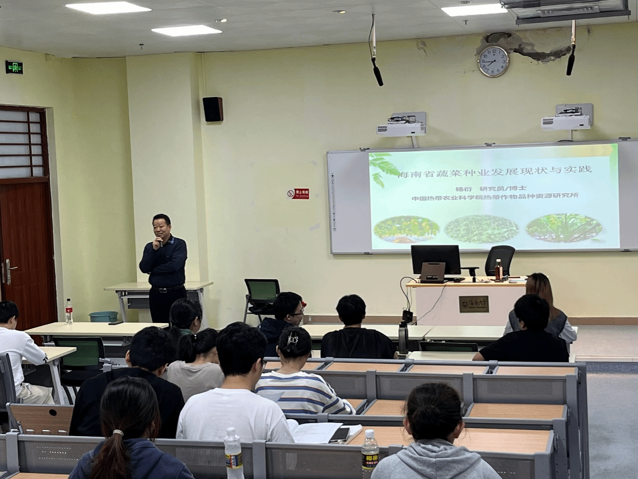 2023年11月30日,中国热带农业科公司杨衍研究员应邀参加388vip太阳集团冬季小学期授课,为2021级设施农业科学与工程专业本科生讲授《设施作物育种学》课程。青年教师路旭代表公司致辞,对杨衍研究员的到来表示热烈欢迎。