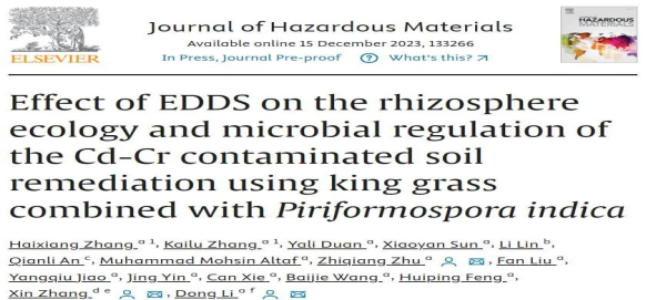 近日,388vip太阳集团朱治强教授团队在Journal of Hazardous Materials上发表了题为“EDDS添加对王草-印度梨形孢共生体系修复Cd-Cr复合污染土壤的根际生态及微生物调控的影响”的研究论文。
