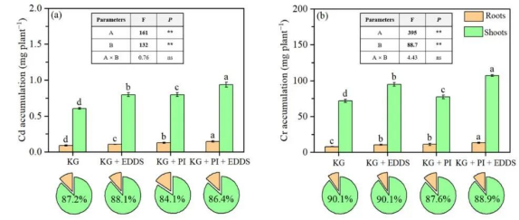 在Cd-Cr复合污染土壤中,Cd和Cr主要积累在地上部。结果表明,EDDS的施用和P. indica的接种协同促进重金属在植株各部位的积累,尤其是地上部(图2)。