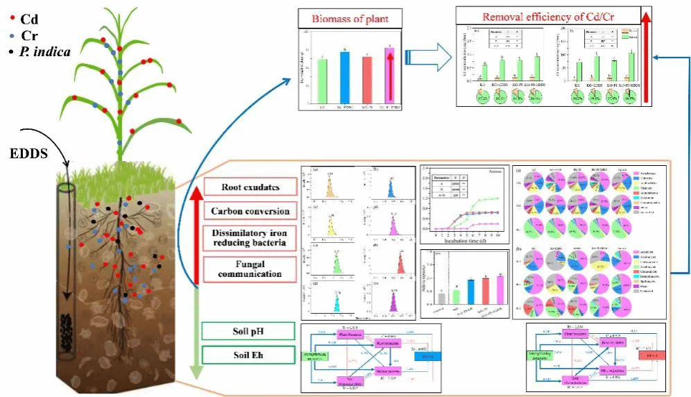 植物修复作为一种绿色修复技术,成为国内外土壤修复关注的焦点。利用螯合剂和微生物增强植物修复成为有效可行的强化修复措施。本研究分别采用高效液相色谱法、Biolog生态板法、荧光定量PCR法和高通量测序法,综合分析了土壤根系分泌物组成、土壤微生物碳源利用、关键基因表达和土壤微生物群落结构的调控作用。[S,S]-乙二胺二琥珀酸(EDDS)的添加可为王草-印度梨形孢(P. indica)共生体系提供良好的根际生态环境,使得土壤pH值降低0.41个单位,刺激琥珀酸和富马酸的分泌,增强氨基酸和碳水化合物的碳源代谢活性,显著提高王草的生物量(25.7%),从而有助于提高Cd/Cr的生物利用度。异化铁还原菌的表达量显著上调99.2%,而梭菌的丰度没有显著变化。此外,土壤根际真菌群落(子囊菌门:45.8%,罗兹菌门:16.7%)的丰富度显著增加,可调节耐受微生物优势类群的比例,增加Cd/Cr去除效率(Cd:23.4%,Cr:18.7%)。这些发现为螯合剂辅助植物-微生物联合修复重金属污染土壤提供理论依据(图1)。