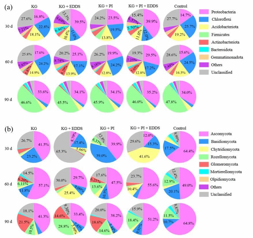 图3 不同处理下主要根际细菌(a)和真菌(b)在门水平的相对丰度
