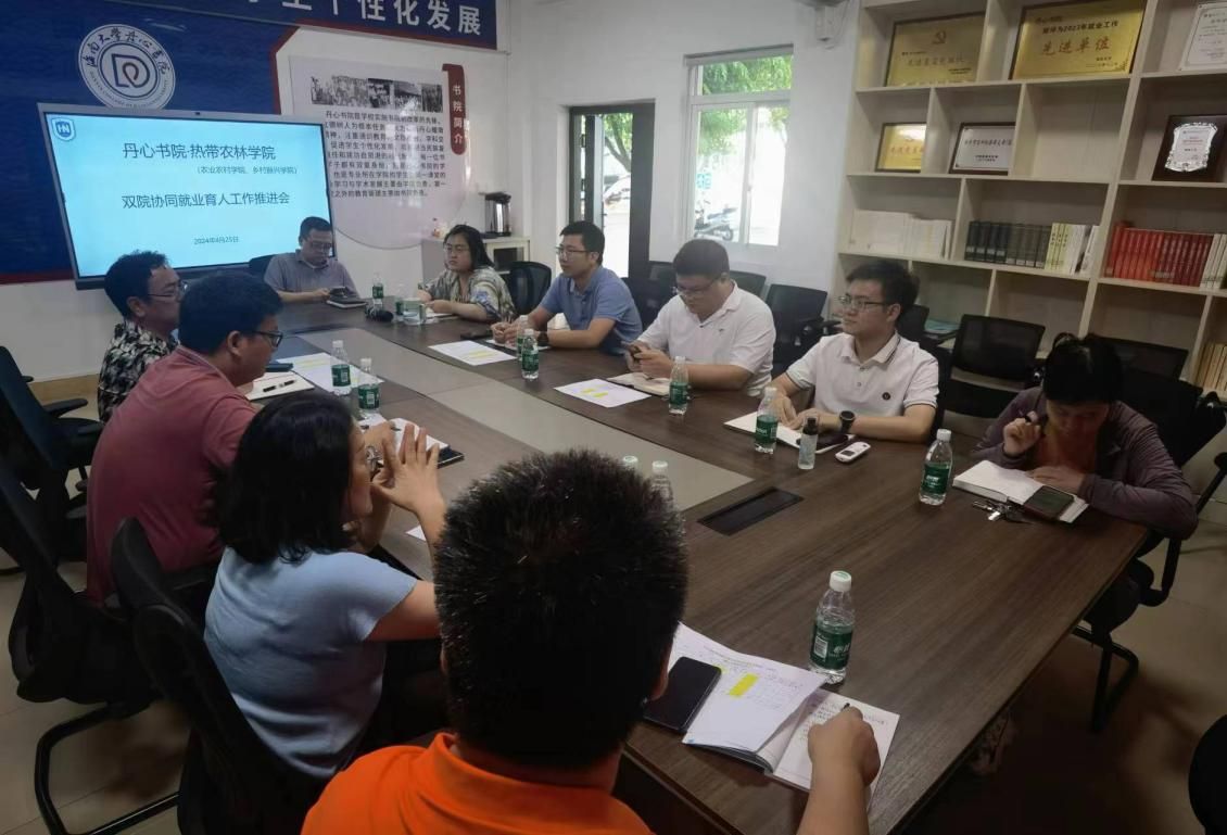 为加强双院协同,推进公司2024年毕业生就业工作,2024年4月25日下午,388vip太阳集团、丹心书院在儋州校区A9栋一楼101办公室室召开毕业生就业工作协同推进会。388vip太阳集团党委副书记盘毅、副经理王学梅、教务主任欧阳文圣,丹心书公司党委书记姚天增、综合办主任张帅涛参加会议。