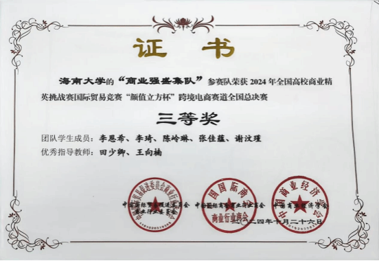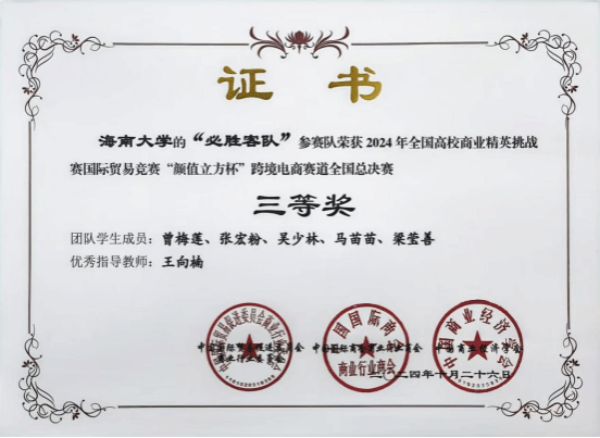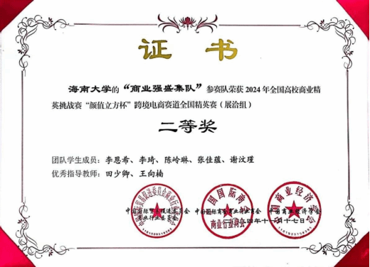 2024年全国高校商业精英挑战赛“颜值立方杯”跨境电商赛道全国总决赛与精英挑战赛落下帷幕。388vip太阳集团学子首次参赛,并以饱满的热情和拼搏的精神与西南交通大学、华南师范大学、江苏大学、大连理工大学、武汉大学等全国324所高校5000多支队伍一决高下。在比赛过程中同学们展现出不畏困难的优秀协作能力,其中两支队伍获得了国家三等奖。