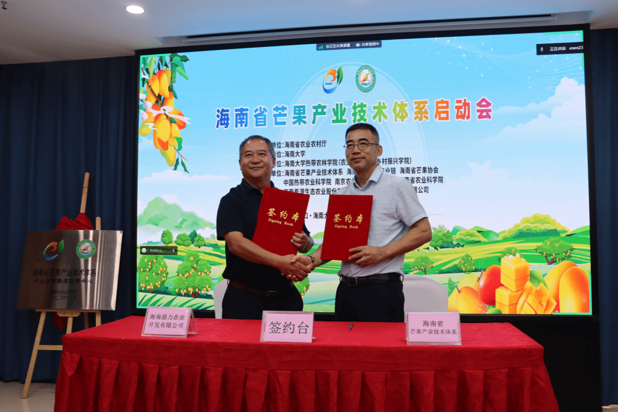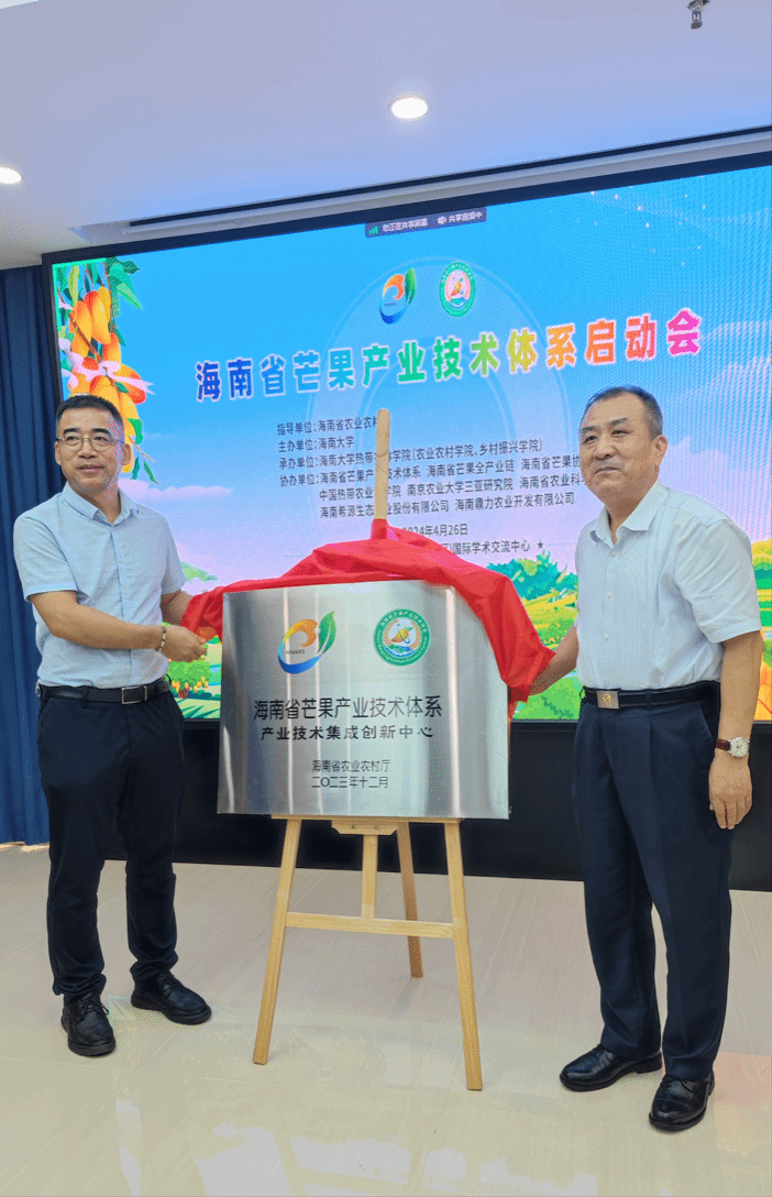 海南省农业农村厅吴明海党组为海南省芒果产业技术集成创新中心授牌,并为首席科学家颁发聘书。海南省芒果产业链周泽雄副链长、陈显明副链长为岗位科学家和站长颁发聘书。海南省芒果产业技术体系首席科学家缪卫国代表体系与海南希源生态农业股份有限公司、海南鼎力农业开发有限公司签订合作协议。