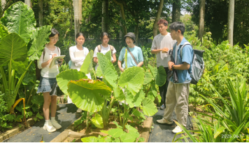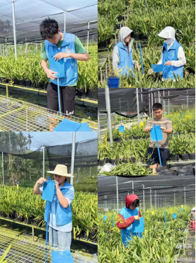 图5 同学们在兰花基地实习 图6 同学们向研学小朋友介绍农耕活动